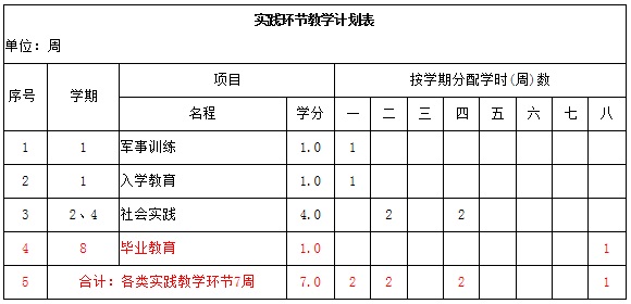 实践环节共4项,7学分。开设:军事训练、入学教育、社会实践、毕业教育等。