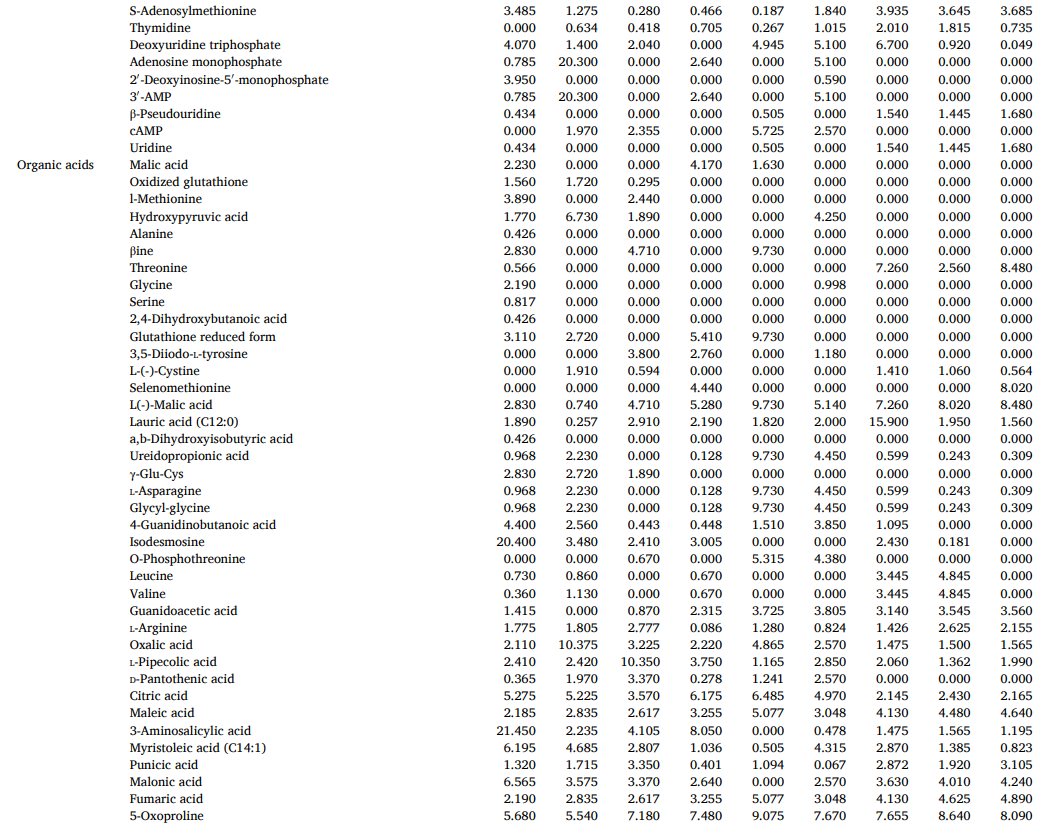 本研究是第一次使用高通量靶向的代谢组学分析ZR、ZRP和CG代谢物的变化;这与以往的研究不同,我们采用Q-TOF的SWATH采集模式进行定性和定量分析。此外,我们成功地将化学衍生化与LC-MS/MS技术相结合,改进了代谢物的分离、检测和鉴定,提高了MS的响应能力和灵敏度和选择性。我们在所有样本中检测到369种代谢物,并将它们归类为14个已知类别。PCA分析和OPLS-DA分析对104种差异代谢物进行了分离和筛选。本研究结果推测,这些碳水化合物、核苷酸、有机酸、脂肪、维生素和苯丙烷的组成和含量的差异可能是ZR、ZRP和CG风味和药理作用差异的根本原因,这些差异可能与代谢物的代谢途径和生物合成有关。本研究为新型ZR食品工业的发展提供了新的理论依据,为ZR及其加工产品的推广应用提供了新的视角,为ZR加工过程中的质量控制提供了新的思路。