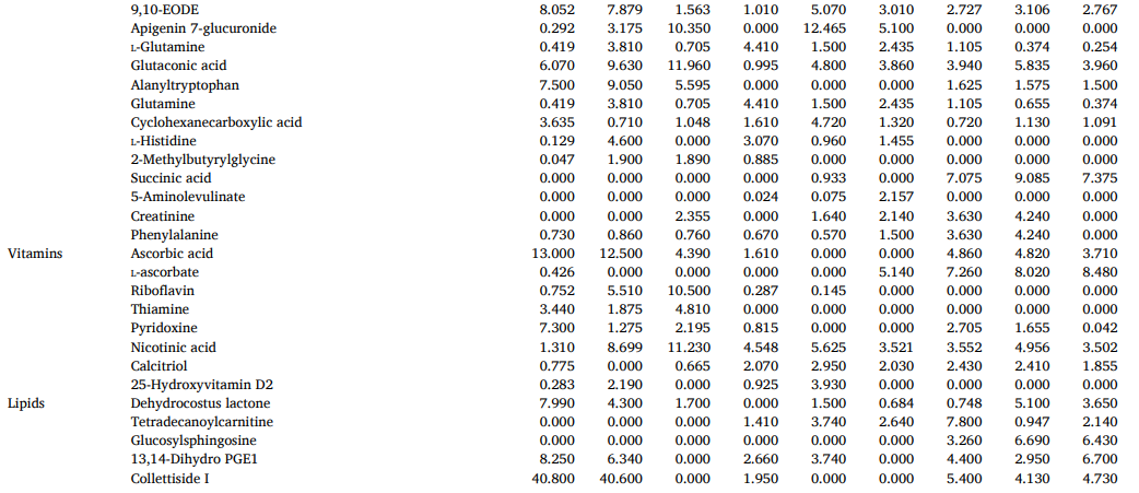 为了进一步探讨不同品种间差异的机制,我们对差异表达的代谢物进行了分析。我们的分析发现,无论是ZR-ZRP组还是ZR-CG组,差异代谢物中都含有大量的碳水化合物,如氨基葡萄糖、糖酸、半乳糖醇、山梨醇、甘露醇、麦芽三糖、鼠李糖、1-酮糖和木糖。根据研究,碳水化合物具有多种生物活性,包括抗氧化、免疫调节、抗炎、伤口愈合和抗糖尿病活性,这可能表明加工后的ZR味道和药理作用均发生了变化。在ZR和ZRP的差异中,有机酸和苯丙烷是第二大类。有机酸被认为是食物香气形成和酸味甜味的重要贡献者,它们还具有增加食欲和促进消化的功能。这一结果可能表明ZR和ZRP在气味、味道和食品应用方面的差异。维生素是一种具有多种基团的有机物质,由区别于ZR和ZRP的差异代谢物组成,在疾病预防和人类健康中发挥着至关重要的作用。其中,抗坏血酸,又称维生素C,对心血管和神经退行性功能障碍等多种疾病具有重要的生理抗氧化作用,这也为在保健功能和营养应用中区分ZR和ZRP提供了新的思路。