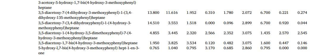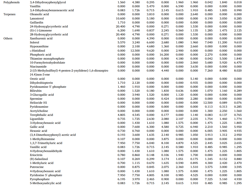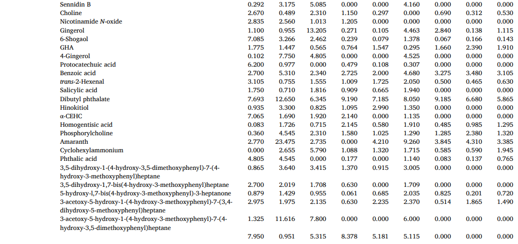 脂类是ZR-CG组中18%的基本区别物质,由于其性质和营养价值,对细胞膜结构和一系列生理活动不可或缺。脂肪分解成游离脂肪酸后,氧化或与其他反应产物反应形成调味化合物,并形成ZR和CG独特的香气特征。核苷酸是ZR和CG中的第四类差异代谢物,是几乎所有生物过程中的关键低分子生物分子,可能与CG的鲜味降低有关。大量证据表明,饮食中核苷酸的来源对免疫功能有重要影响,并维持最佳的生理功能,为ZR和CG免疫调节配方和营养产品的开发提供了支持数据。其他标志性代谢物在ZR和CG中也显示出一些具有多方面药理作用的特征成分,如姜辣素、6-姜烯酚和二芳基庚烷类化合物。CG的抗氧化能力远远低于ZR,这是由于上述成分的含量减少了。