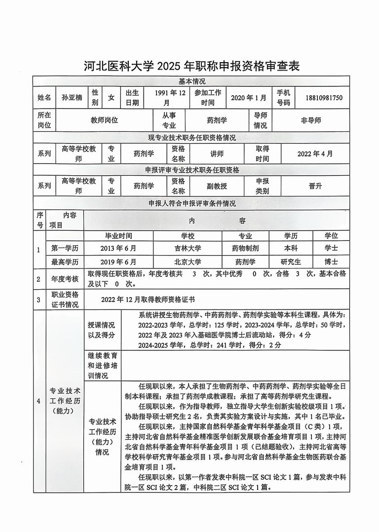 专业技术职务任职资格情况一览表-孙亚楠