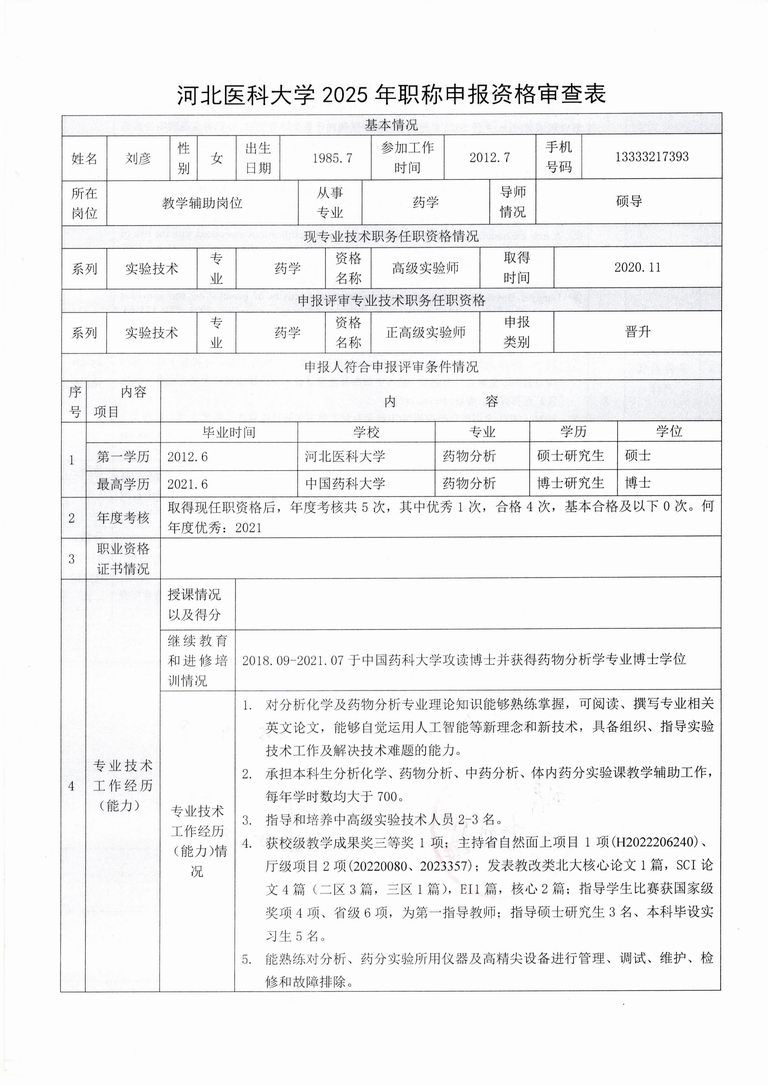 专业技术职务任职资格情况一览表-刘彦