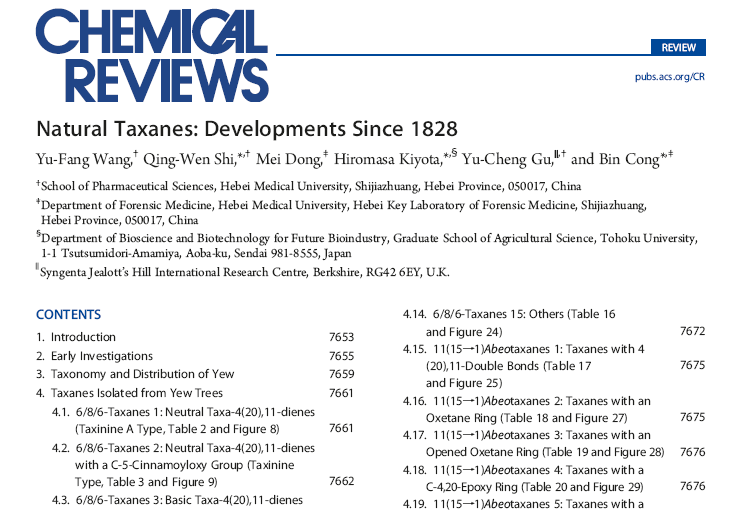 5. Yu-Fang Wang, Qing-Wen Shi, Mei Dong, Hiromasa Kiyota, Yu-Cheng Gu, and Bin Cong, Natural Taxanes: Developments Since 1828, Chem. Rev. 2011,111,7652.