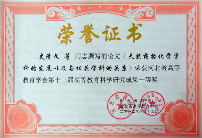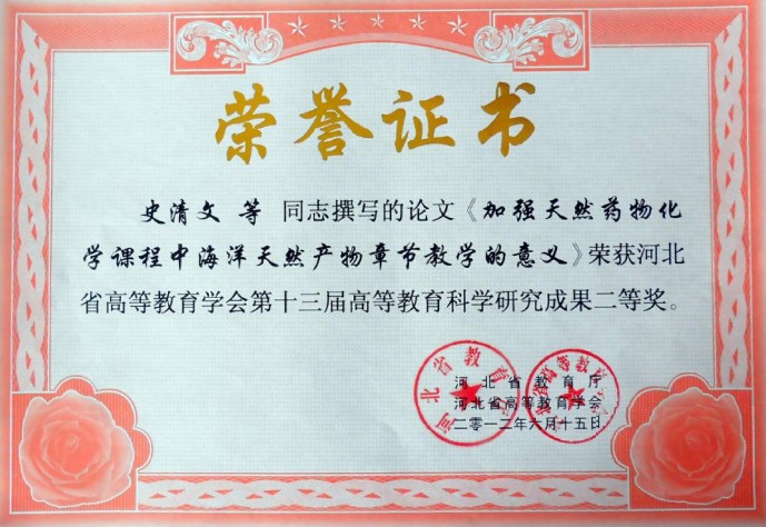 由我室史清文、李力更、霍长虹、张??丽和王于方撰写的《天然药物化学学科的发展以及与相关学科的关系》(中草药, 2011, 42(8): 1457)及《加强天然药物化学课程中海洋天然产物章节教学的意义》(药学教育, 2011, 27 (4): 23)两篇教学改革论文,分别荣获河北省高等教育学会第十三届高等教育科学研究成果一等奖和二等奖。