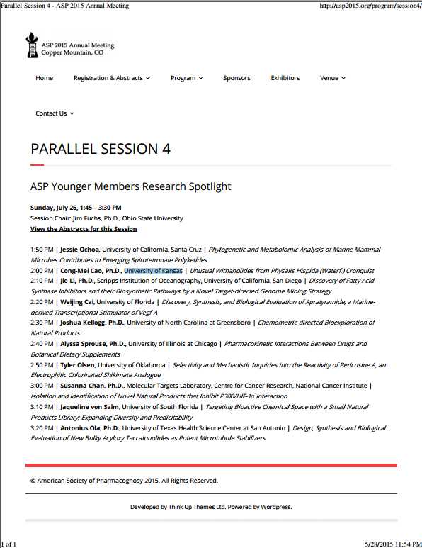 我室培养的研究生?聪梅受美国化学会生药学会年会(American Society of Pharmacognosy 2015 Annual Meeting)邀请参会,并被列为杰出青年研究者在大会做研究报告(详见://asp2015.org/program/session4/),也被评为著名国际学术出版集团Elsevier的杰出审稿人(Outstanding Reviewer)。