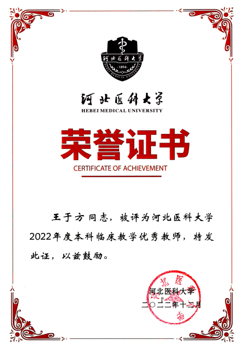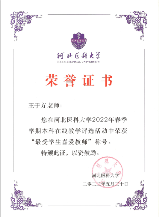 我室王于方老师荣获“快三 在线教学最受学生喜爱教师”及“本科临床教学优秀教师”称号。这是我室在本科生教学中继微课大赛、化学大赛等之后的又一佳绩。